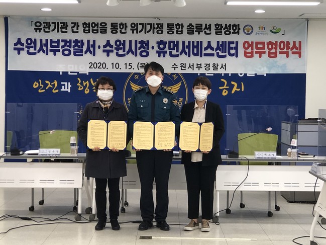 [로컬라이프] 수원시와 수원시휴먼서비스센터, 수원서부경찰서는 15일 수원서부경찰서에서 업무협약을 체결하고, 위기가정 문제해결·지원을 위한 협력체계를 강화하기로 했다.
