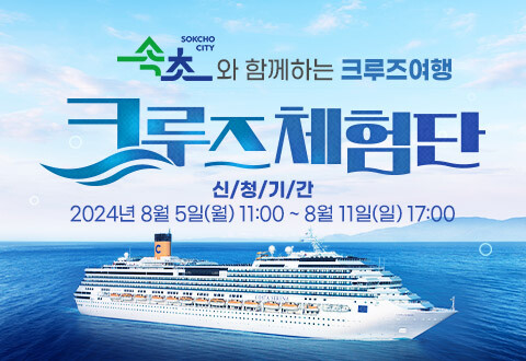 속초시는 크루즈산업 활성화를 위하여 속초시민을 대상으로 속초항 모항 크루즈 체험단 15팀(30명)을 8월 5일부터 8월 11일까지 최초로 모객한다.