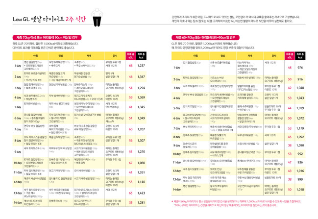 ‘Low GL 뱃살 다이어트 2주 식단표’는 지엘(GL) 다이어트의 식단 구성 원칙에 따라 칼로리는 물론 예상 GL섭취량까지 꼼꼼하게 고려해 반영한 식단이다. 포만감은 크고 별미로 즐길 수 있는 요리들로 구성 돼 있어 부담 없이 시도해볼 수 있다. 매 끼니를 직접 준비하기 어려운 경우 개인의 기호나 식사 장소를 고려하여 비슷한 열량의 메뉴로 식단을 바꾸어 실천할 수 있다.