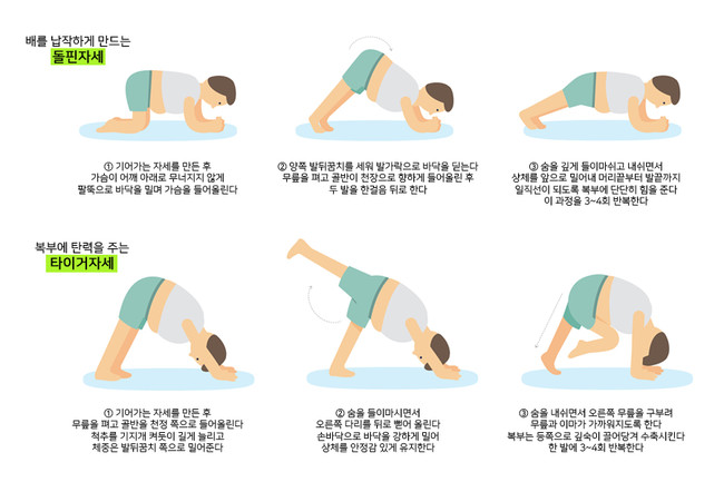 2주 치 식단과 함께 운동을 함께 병행하면 더욱 효과적이다. 풀무원은 뱃살 감량 효과를 기대하며 지엘 다이어트를 실천하는 사람들을 위해 복부에 더 강한 자극을 가할 수 있는 두 가지 운동법 ‘돌핀자세’와 ‘타이거 자세’를 제시했다.