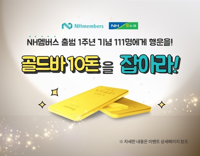 또한 지난달 23일부터 29일까지 ‘도전! 골드바를 잡아라!’ 이벤트도 진행 중으로, NH멤버스앱에서 해당 이벤트에 응모한 고객 중 추첨을 통해 총 111명에게 1등 골드바 10돈(1명), 2등 50만 NH포인트(10명), 3등 5만 NH포인트(100명)등 푸짐한 경품을 제공한다.