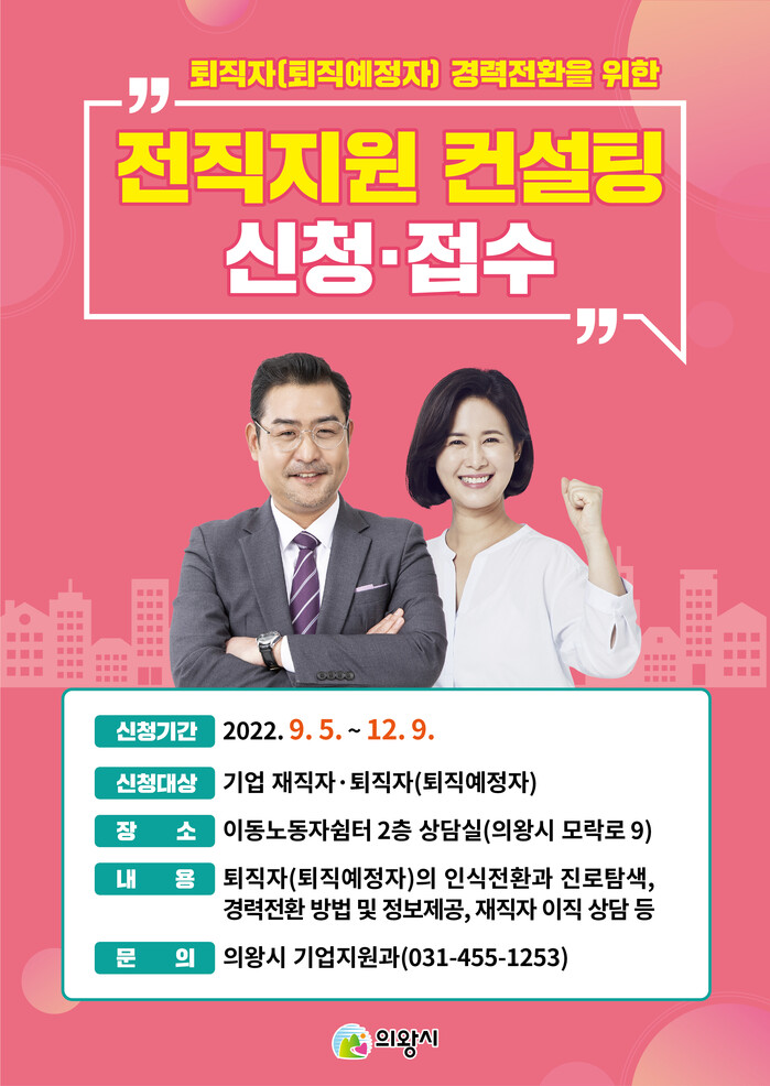 전직지원 컨설팅에 관한 자세한 사항은 의왕시청 기업지원과(031-345-2357)로 문의하면 된다.