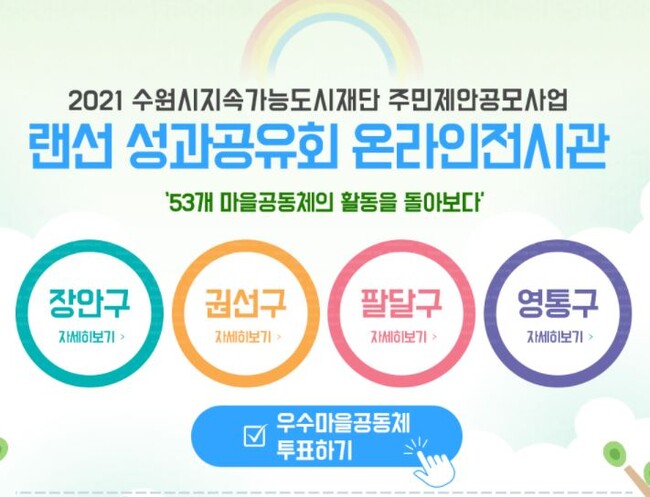 수원도시재단은 6~12일 7일간 수원시 주민들의 마을공동체 활동 성과를 홍보하고 격려하기 위한 ‘2021년 주민제안 통합공모사업(마을공동체 분야) 랜선 성과공유회’를 개최한다.