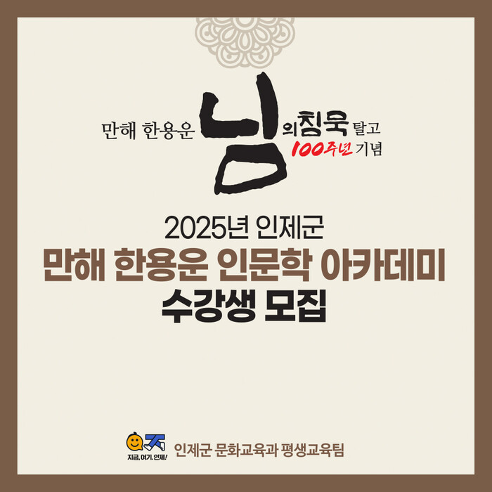 인제군은 만해 한용운의 시집 「님의 침묵」 탈고 100주년을 기념해 ‘2025년 만해 한용운 인문학 아카데미’를 운영하며, 수강생을 모집한다고 밝혔다.