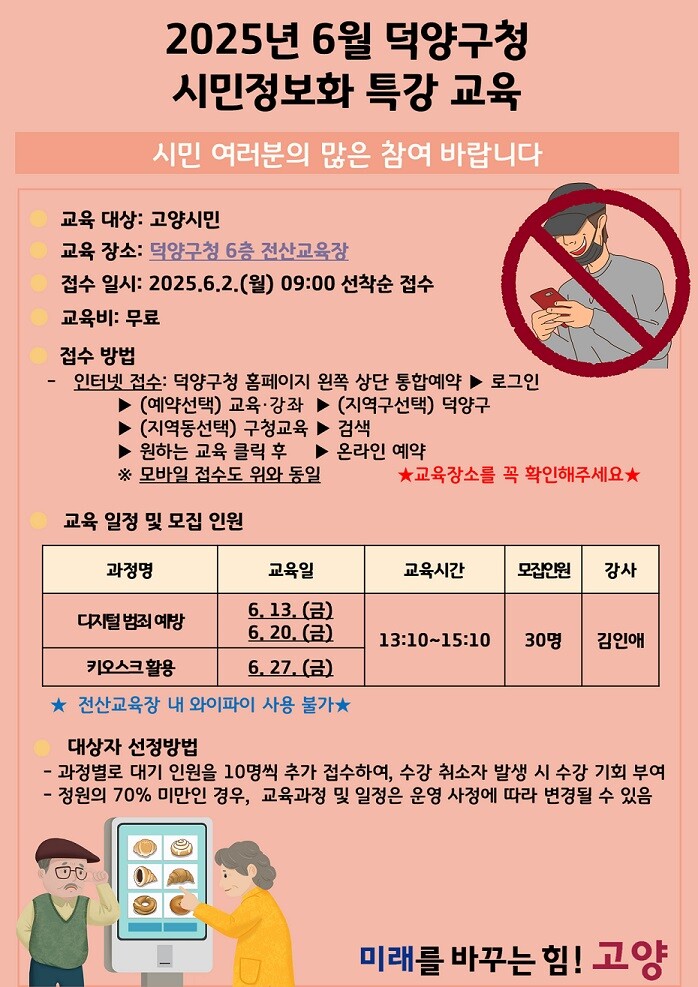 6월 시민정보화교육은 △디지털 범죄 예방 △키오스크 활용 과정으로 구성됐다. 디지털 범죄 예방은 은 6월 13일·20일, 키오스크 활용은 6월 27일 덕양구청 6층 전산교육장에서 진행된다.