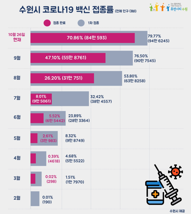 수원시가 코로나19 백신 예방접종을 시작한 지 8개월 만인 10월 26일 접종 완료율 70%를 돌파했다.
