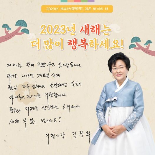 [로컬라이프] 송준형 기자 = 김경희 이천시장은 "2023년 새해는 더 많이 행복하세요!"라고 전했다.