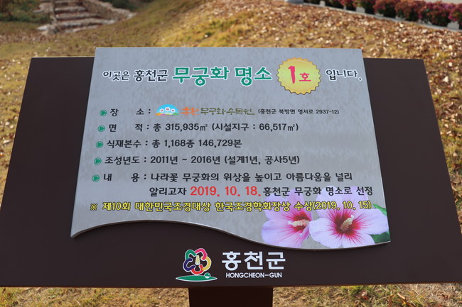 홍천군 무궁화 명소 1호로 선정된 홍천무궁화수목원은 국내 최초 무궁화를 테마로 조성한 공립수목원으로서 2017년 7월 개원하여 16개 주제원을 비롯한 힐링숲길, 무궁누리길 등 다양한 즐길거리로 많은 방문객들이 찾고 있으며, 다양한 해설·체험 프로그램 운영, 계절별 꽃밭조성 등 수목원을 찾는 방문객들에게 새로운 즐길거리를 제공하고자 노력한 결과, 올해 11월 6일까지 무궁화수목원을 찾은 관광객 수는 10만3,767명으로 지난해(7만169명)보다 48%가량 증가하였다.