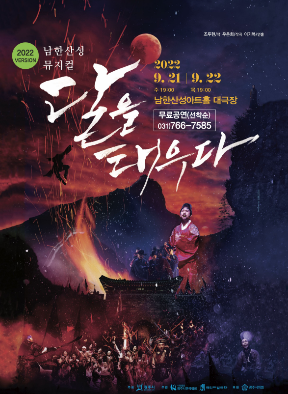 남한산성을 주제로 만든 창작뮤지컬‘달을 태우다’가 오는21일과22일 오후7시 남한산성아트홀 대극장에서 공연된다.