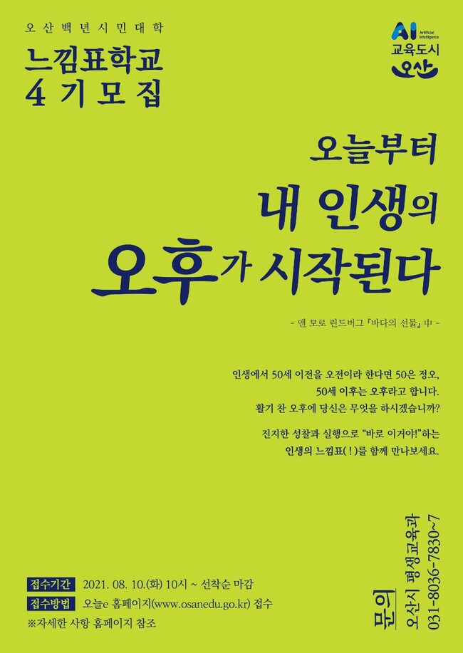 오산시(시장 곽상욱)는 신중년 대상 평생학습 장기프로젝트 「오산백년시민대학 느낌표학교」4기 신입생을 모집한다고 4일 밝혔다.