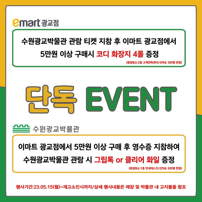 이마트에서 광교박물관에서 관람하고 받은 티켓과 이마트 구매 영수증(5만 원 이상)을 제시하면 화장지 4롤을, 광교박물관에서 관람할 때 이마트 구매 영수증(5만 원 이상)을 제시하면 기념품(그립톡 혹은 클리어화일)을 증정한다.
