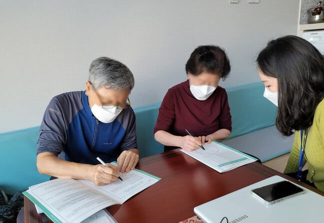 사진/기흥구보건소에서 운영하는 비대면 건강관리서비스 시범사업에 참여하는 어르신들이 건강상태를 확인하기 위한 설문지를 작성하고 있다.(사진제공=용인시)