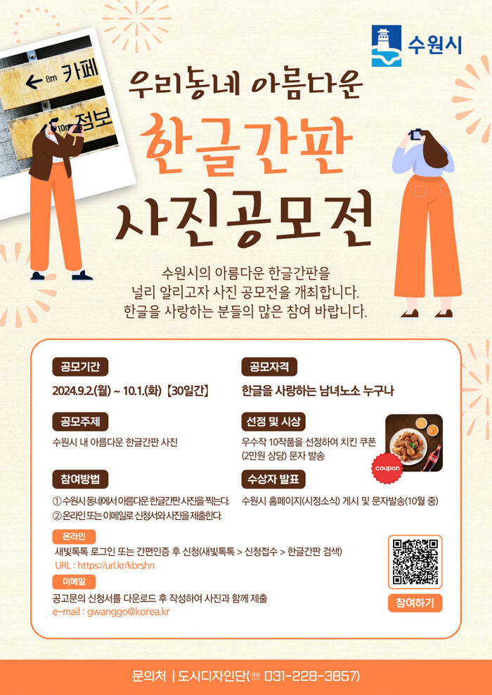 한글의 우수성과 독창성을 잘 살리며 주변과 조화를 이루는, 수원의 아름다운 한글간판을 촬영해 응모하면 된다. 한글을 사랑하는 누구나 참여할 수 있다.