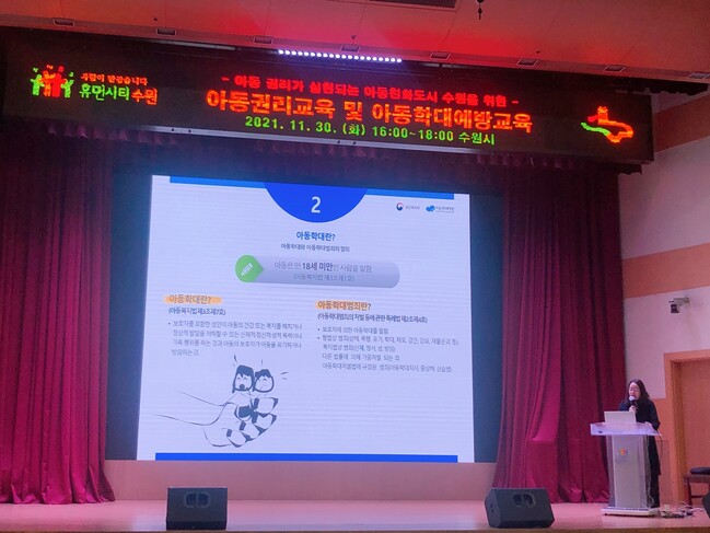 강의를 한 안소영 수원시아동보호전문기관 관장은 ‘신체 학대’, ‘정서 학대’ 등 아동학대의 유형을 설명하고, “아동학대 의심 징후를 발견하면 먼저 아동의 안전을 확보한 후 학대 의심 아동의 보호자에게 알리지 말고, 경찰(112)에 신고해야 한다”고 강조했다.