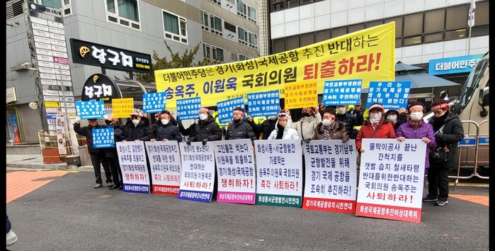 경기국제공항추진시민연대는 17일 더불어민주당 중앙당사 앞에서 결의대회를 열고, “화성시 화옹지구에 경기국제공항을 조속히 건설하라”고 촉구했다.