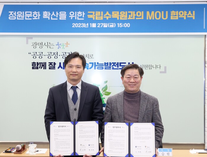 광명시(시장 박승원)는 지난 27일 시청 중회의실에서 국립수목원(원장 최영태)과 정원문화 확산을 위해 공동협력하고자 업무협약(MOU)을 체결했다.