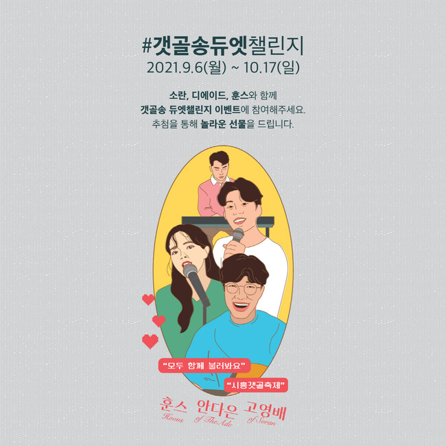 ‘갯골송 듀엣챌린지’는 제16회 시흥갯골축제의 메인 프로그램이다. 오는 10월 17일까지 시흥갯골축제 인스타그램에서 진행되며, 소란의 고영배, 디에이드의 안다은, 훈스가 듀엣 멤버로 참여한다.