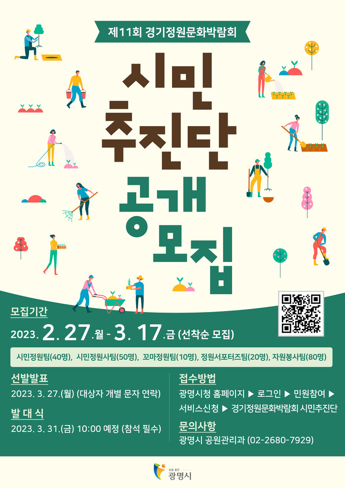 광명시(시장 박승원)는 오는 10월 개최하는 ‘제11회 경기정원문화박람회’를 앞두고 시민이 직접 참여하여 광명시만의 생동감 있는 정원을 만들기 위해 27일부터 ‘경기정원문화박람회 시민추진단’을 모집한다고 밝혔다.