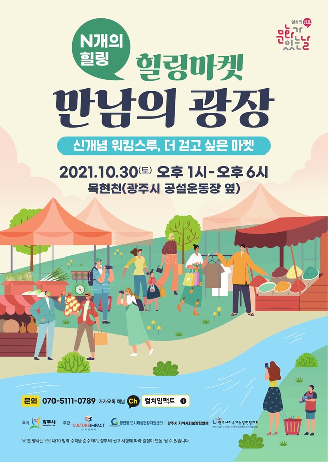 광주시와 컬쳐임팩트는 오는 30일 광주시 공설운동장 목현천 인근에서 문화힐링마켓 ‘만남의 광장’을 오픈한다.