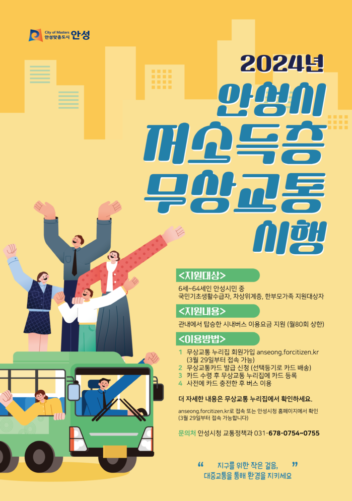 안성시 저소득층 무상교통 신청은 오는 3월 29일부터 가능하며, 안성시 무상교통 누리집(anseong.forcitizen.kr)에서 회원가입 후 카드를 신청하면 우편으로 발송된다. 수령한 카드를 누리집에 등록한 후 자비로 선충전하여 이용하면 월별로 이용한 버스 요금을 다음 달 말에 환급받을 수 있다.