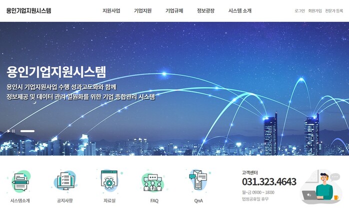 시와 용인시산업진흥원이 공동 운영하는 이 시스템은 지원사업, 기업지원, 기업규제신고 등을 갖추고 있다. 특히 지원 사업 신청을 손쉽게 할 수 있도록 구성한 것이 특징이다.