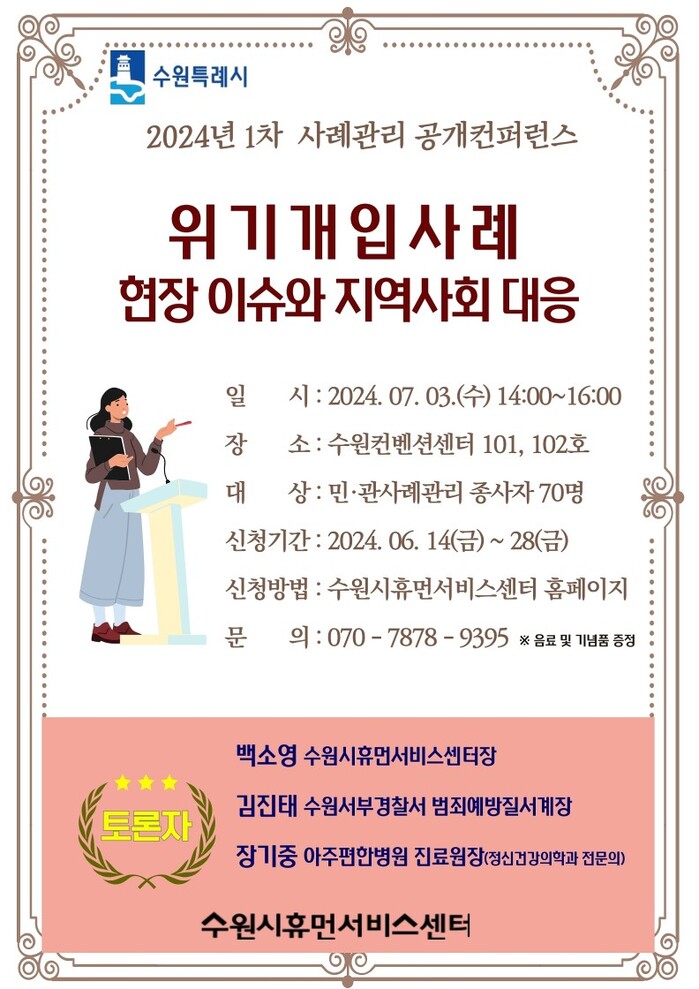 수원시휴먼서비스센터가 7월 3일 오후 2시 수원컨벤션센터에서 ‘위기개입사례 현장이슈와 지역사회 대응’을 주제로 ‘수원시 사례관리 공개콘퍼런스’를 개최한다.