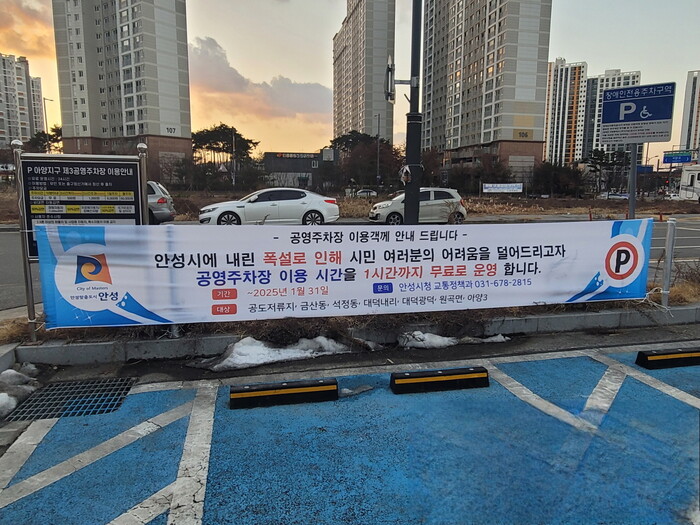 안성시는 폭설로 인한 특별재난지역 선포에 따라 시민들의 경제적 부담을 덜고 지역사회의 빠른 회복을 지원하기 위해 관내 공영주차장 7개소를 최초 1시간 무료로 이용할 수 있도록 운영한다고 23일 밝혔다.
