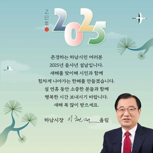 [하남=로컬라이프] 송준형 기자 = 이현재 하남시장은 27일, 자신의 페이스북을 통해 ‘하남시민 여러분, 2025년 을사년 설날입니다. 설 연휴 동안 소중한 분들과 함께 행복한 시간 보내시기 바랍니다. 새해 복 많이 받으세요’라고 전했다.
