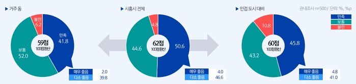시흥시민은 거주환경에 만족(41.8%)하는 것으로 나타났다. 특히 거주지가 아닌 시흥시 전체 거주 만족도는 보다 높았다(50.6%). 거주만족도가 대중교통과 인프라 등 편의시설을 포함한 항목이어서, 시의 지역 균형발전과 교통혁신 추진이 효과를 나타낸 것으로 해석된다.