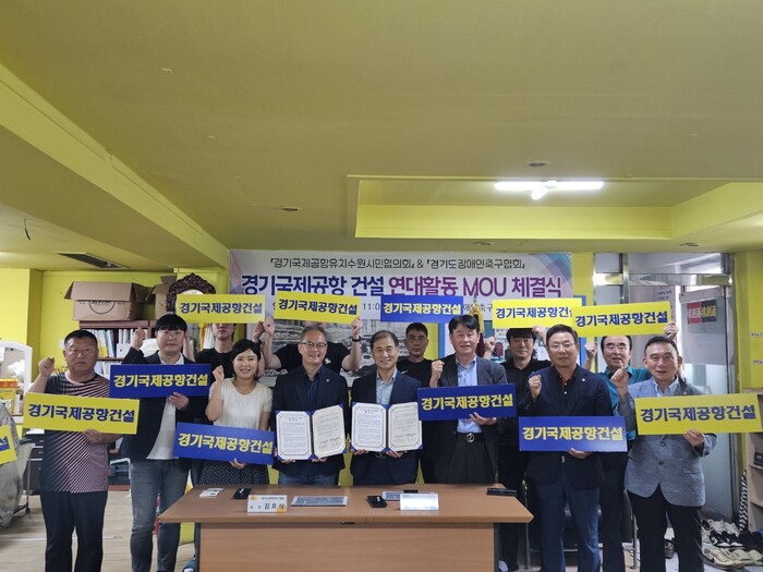 오늘로써 경기국제공항유치수원시민협의회(이하 ‘시민협의회’)는 경기국제공항 건설을 위한 협력을 강화하기 위해 경기도장애인축구협회 및 수원시생활폐기물수집운반협회와 24번째 업무협약(MOU)을 체결했다.