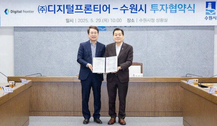 수원시와 ㈜디지털프론티어는 29일 시청 상황실에서 협약을 체결하고, 협력을 약속했다. 협약식에는 이재준 수원시장, ㈜디지털프론티어 오성구 대표, 김태영 전무 등이 참석했다.