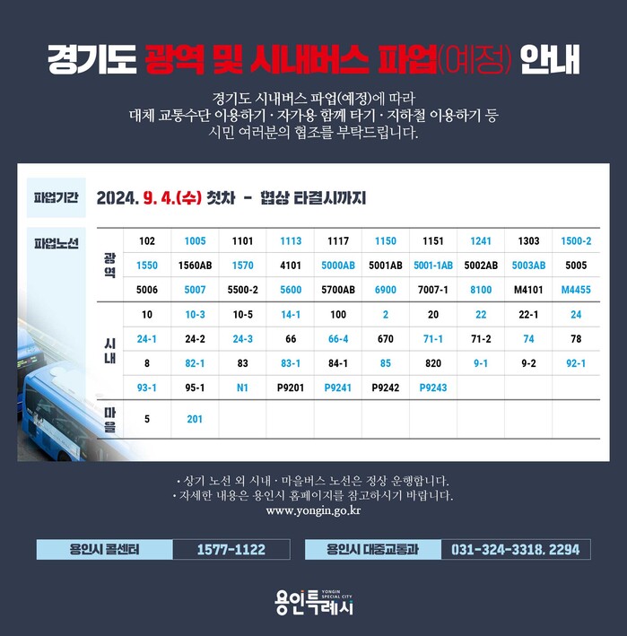 경기도버스노동조합협의회의 파업 관련 소식과 전세버스 투입 노선 등에 대한 정보는 용인시 홈페이지(https://www.yongin.go.kr)를 통해 확인할 수 있다.