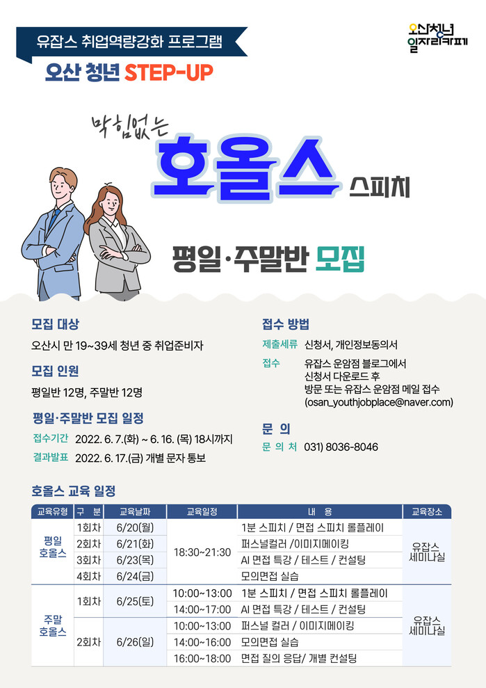 오는 6월 20일부터 진행되는 ‘막힘없는 호올스 스피치’는 6월 7일(화)부터 6월 16일(목)까지 선착순으로 참여자를 모집한다. 모집 대상은 오산 관내 미취업 청년(만 19세 ~ 39세)으로 참여를 희망하는 청년은 유잡스 운암점 블로그를 통해 참여 신청서를 작성한 후 이메일로 제출하면 된다.