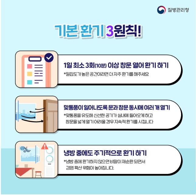 사람이 많고, 창의 크기가 작고, 바람이 적다면 더 잦은 환기가 필요하다. ①하루 최소 3회, 매회 10분 이상 창문 열어 환기하기 ②맞통풍이 일어나도록 문과 창문 동시에 여러 개 열기 ③냉방 중에도 주기적으로 환기하기와 같은 기본환기 3원칙을 준수해야 한다.