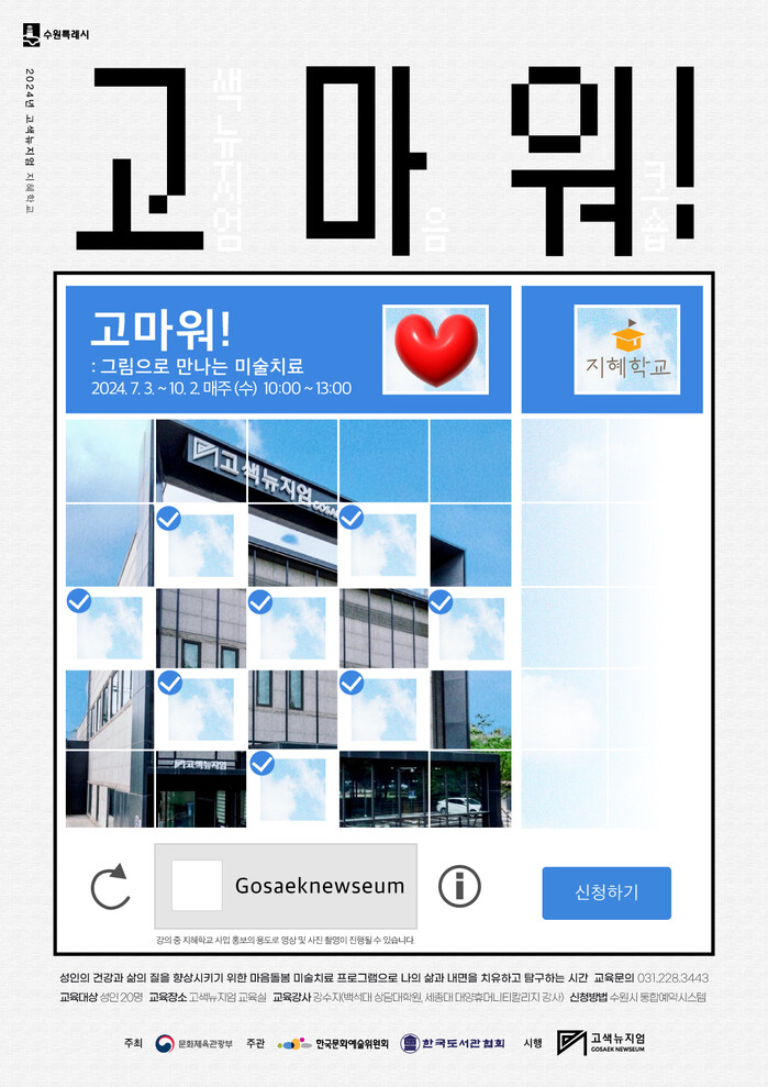 수원시 고색뉴지엄이 2024년 지혜학교 공모사업의 일환으로 ‘고마워! : 그림으로 만나는 미술치료’ 프로그램의 참가자를 모집한다.