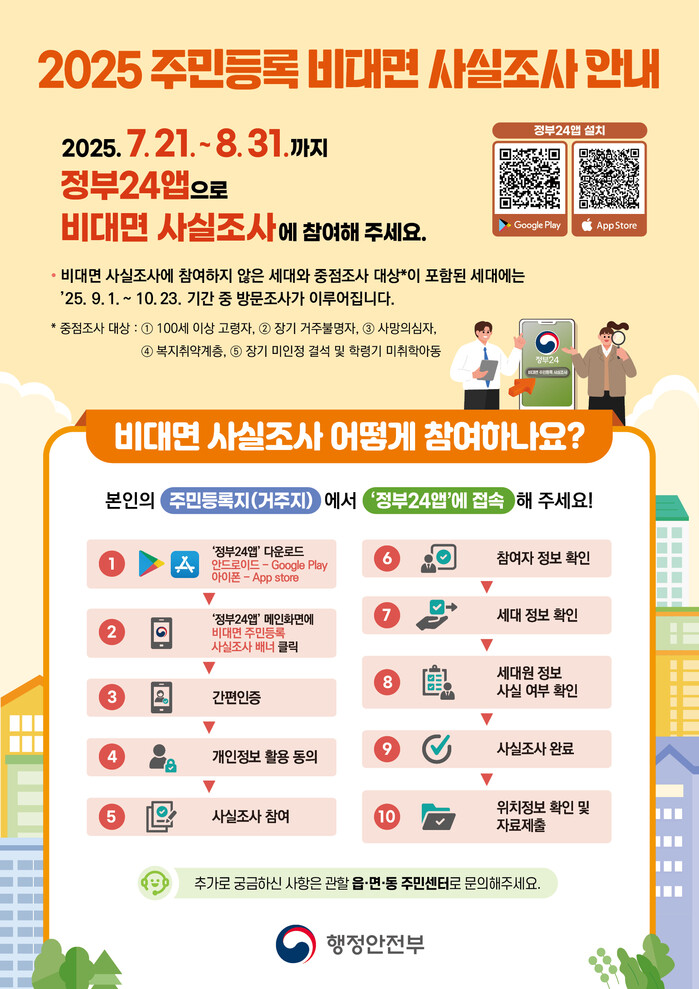 먼저 7월 21일부터 8월 31일까지는‘비대면-디지털 조사’(이하‘비대면 조사’)를 진행하며, 조사 대상자가 본인의 거주지(주민등록지)에서‘정부24’앱에 접속한 후 사실조사 사항에 응답하는 방식으로 진행된다.