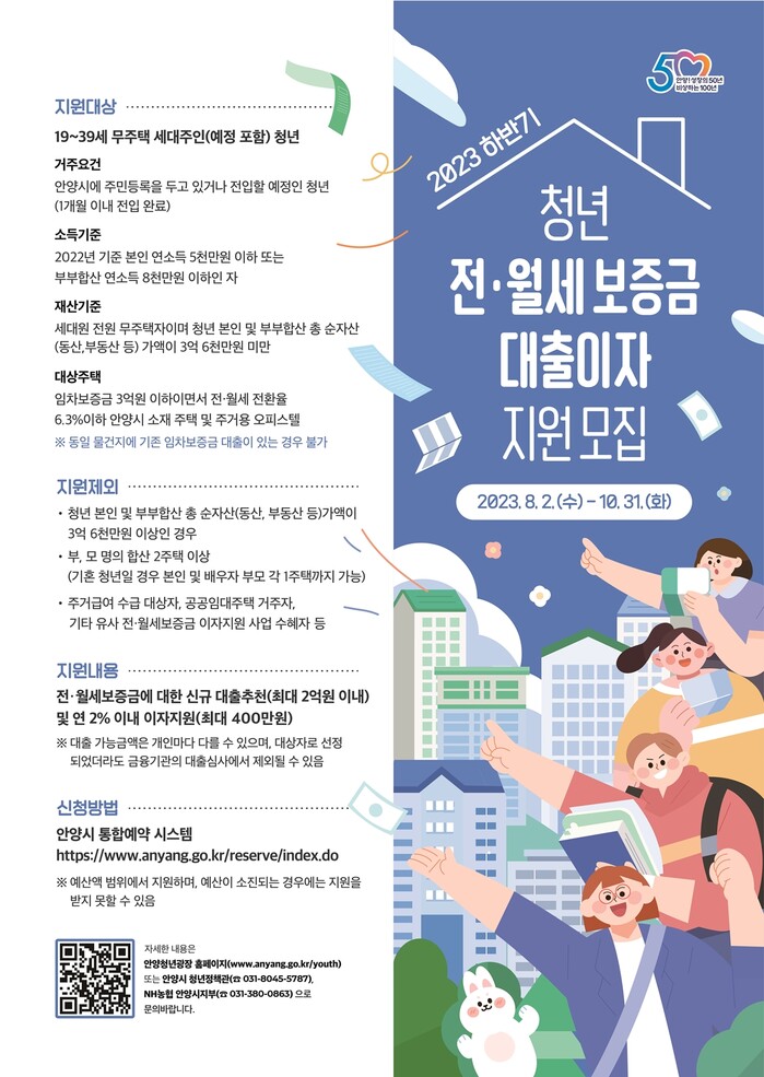 안양시가 목돈 마련이 어려운 무주택 청년층의 주거 안정을 위해 시행하는 ‘청년 전·월세 보증금 대출이자 지원’ 사업 하반기 대상자를 모집한다고 28일 밝혔다.