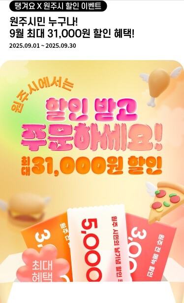 이번 할인쿠폰은 9월 1일부터 5일까지 매일 예산 소진 시까지 제공되며, 앱을 통해 원주시 가맹점에서 2만 원 이상 주문할 때 사용할 수 있다.