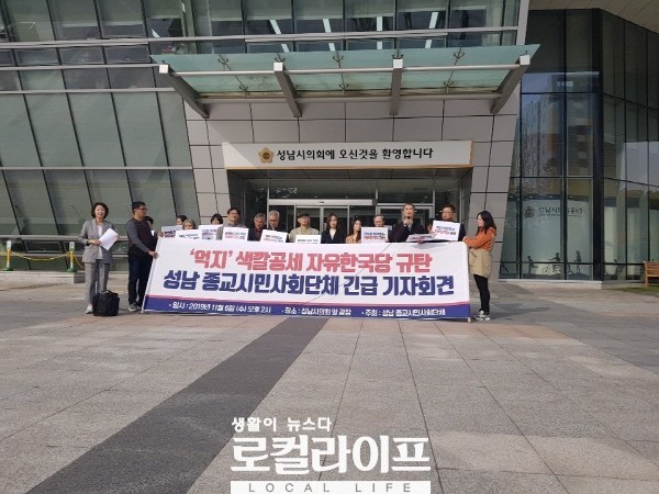 공공의료성남시민행동, 노후희망유니온 경기동남부지부, 성남민주화운동사업회, 성남4.16연대, 성남여성의전화, 성남용인평화와통일을여는사람들, 성남주민연대, 성남평화연대, 성남환경운동연합, 6.15공동선언실천 남측위원회 성남본부, 한반도통일을위한형화행동 등은 6일 오후, 성남시의회 앞 광장에서 ‘억지 색깔 공세 자유한국당 규탄 긴급기자회견’을 가졌다.