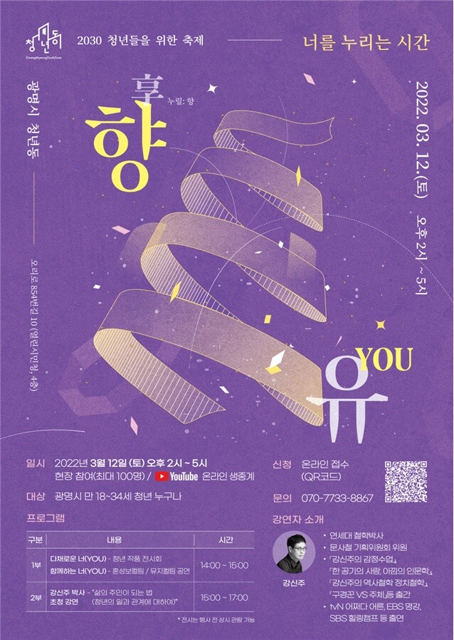 ‘향(享)YOU-너를 누리는 시간’은 포스터에 기재된 QR코드를 이용한 온라인 신청으로 최대 100명까지 현장 참여가 가능하며, 유튜브 생중계도 동시에 진행된다.