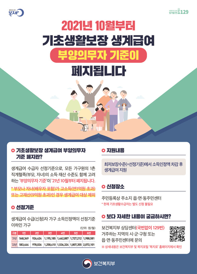 정부는 10월부터 ‘부양의무자 기준’ 적용을 폐지해 기초생활보장 수급 대상자에게 현금을 지급하는 ‘생계급여’ 혜택을 더 많은 시민이 받을 수 있도록 지원 대상을 확대한다.