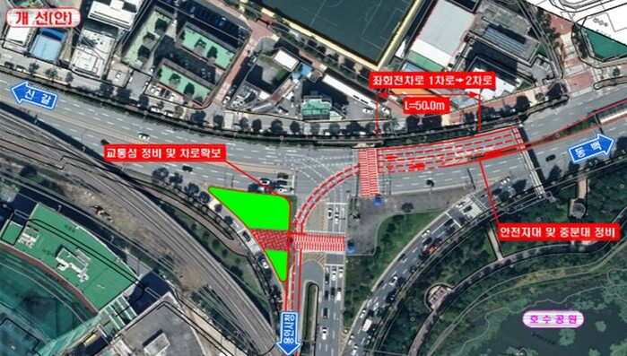 시는 양방향 차로 중앙에 있는 안전지대 일부를 정비해 1‧2차로에 60m 길이의 좌회전 구간을 설치한다. 교차로를 지나 좌회전 후 시청으로 향하는 직선 차로도 2차로로 늘려 병목현상이 발생하지 않도록 조치한다. 이를 위해 교통섬 일부를 정비한다.