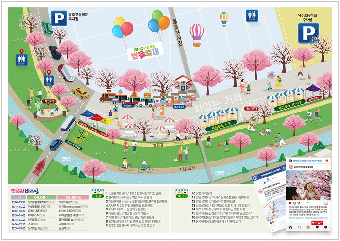9일 축제의 하이라이트인 벚꽃콘서트는 오후 7시에 안양천과 벚꽃 등 아름다운 안양의 봄을 배경으로 열린다. 가수 박세욱·장승미, 소프라노 문경민, 헤바밸리댄스가 출연해 시민에게 감동을 선사할 계획이다.