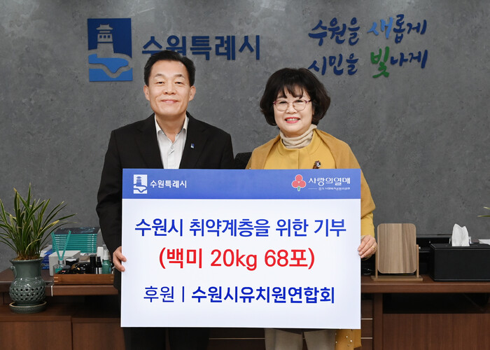 수원시유치원연합회가 “도움이 필요한 저소득층 이웃에 전달해 달라”며 수원시에 20kg 들이 백미 68포를 기부했다.