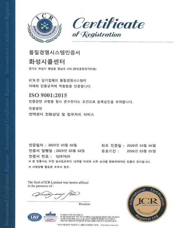 화성시가 9년 연속 시정업무 전화민원 서비스 분야로 ‘ISO 9001:2015 품질경영시스템’인증을 획득했다.