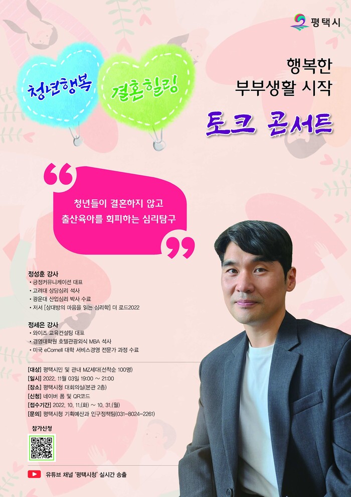 평택시(시장 정장선)는 오는 11월 3일(목) 저녁 7시에 평택시청 대회의실에서 청년행복 결혼힐링 토크콘서트를 개최한다고 밝혔다.
