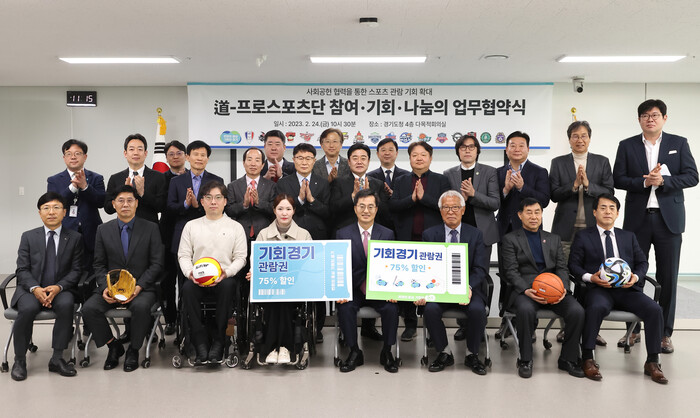 김동연 경기도지사와 도내 연고 18개 프로스포츠단 단장은 도민 스포츠 관람 기회를 확대하고 도민 스포츠 기본권을 높이기 위해 24일 경기도청 상황실에서 ‘도-프로스포츠단 참여, 기회, 나눔의 업무협약’을 체결했다.