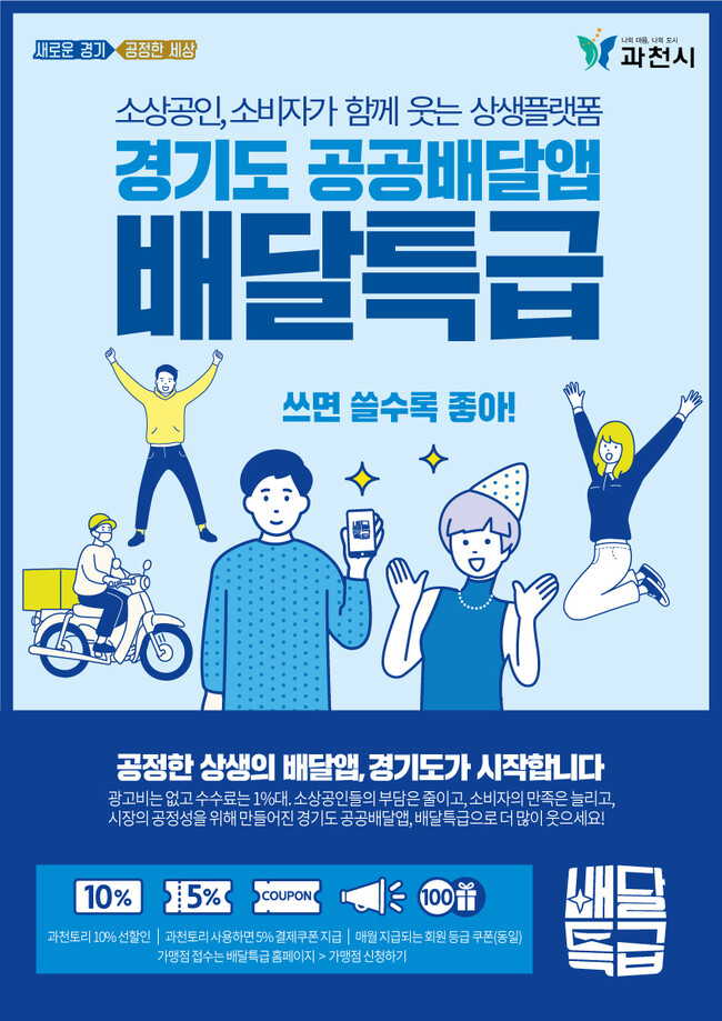 한편, 시는 지난 10월부터 외식업체를 대상으로 ‘배달특급’ 가맹점을 집중 모집했으며, 현재 입점한 과천시 관내 업체는 70여 곳이다. 가맹 등록 희망 업체는 경기도 배달특급사이트(www.specialdelivery.co.kr)에서 상시 신청할 수 있다.