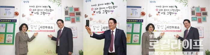 이날 최대호 시장은 "아내와 함께 갈산동 행정복지센터에서 사전투표를 하고 왔다. 사전투표 인증샷 장소도 마련되어 저희 부부도 포즈를 취해보았다"며 "가족들과 투표장에 나오셔서 추억을 남기시면 좋겠다"고 밝혔다.