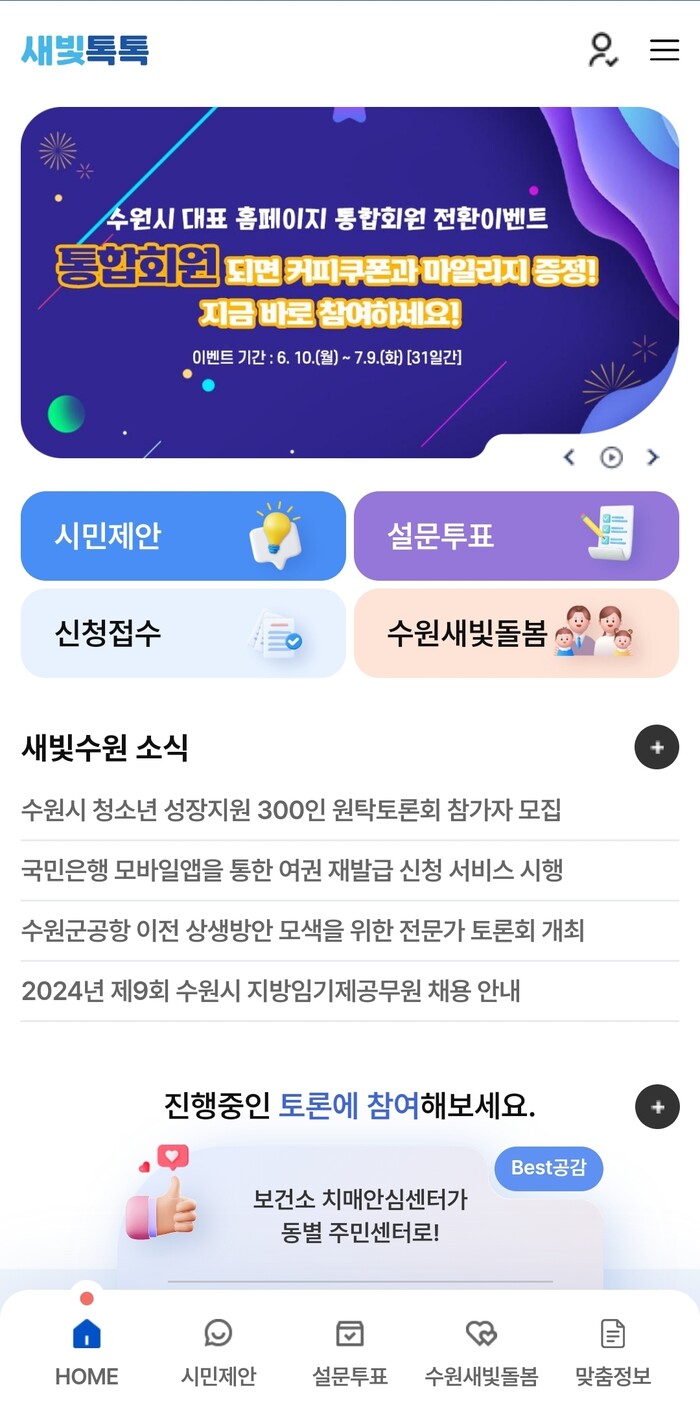 2023년 7월 1일 정식 서비스를 시작한 모바일 시정참여 플랫폼 새빛톡톡은 시민이 참여하고, 소통하는 온라인 광장이다.